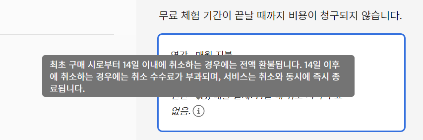 또 무료체험 기간 종료 후 자동으로 저장 되어 있는 카드 정보로 매월 구독료가 결제되는 방식이기 때문에 최초 구매시로 부터 14일 이내에 취소하여야 전액 환불이 된다고 합니다. 서비스는 또한 취소와 동시에 즉시 종료된다고 합니다.