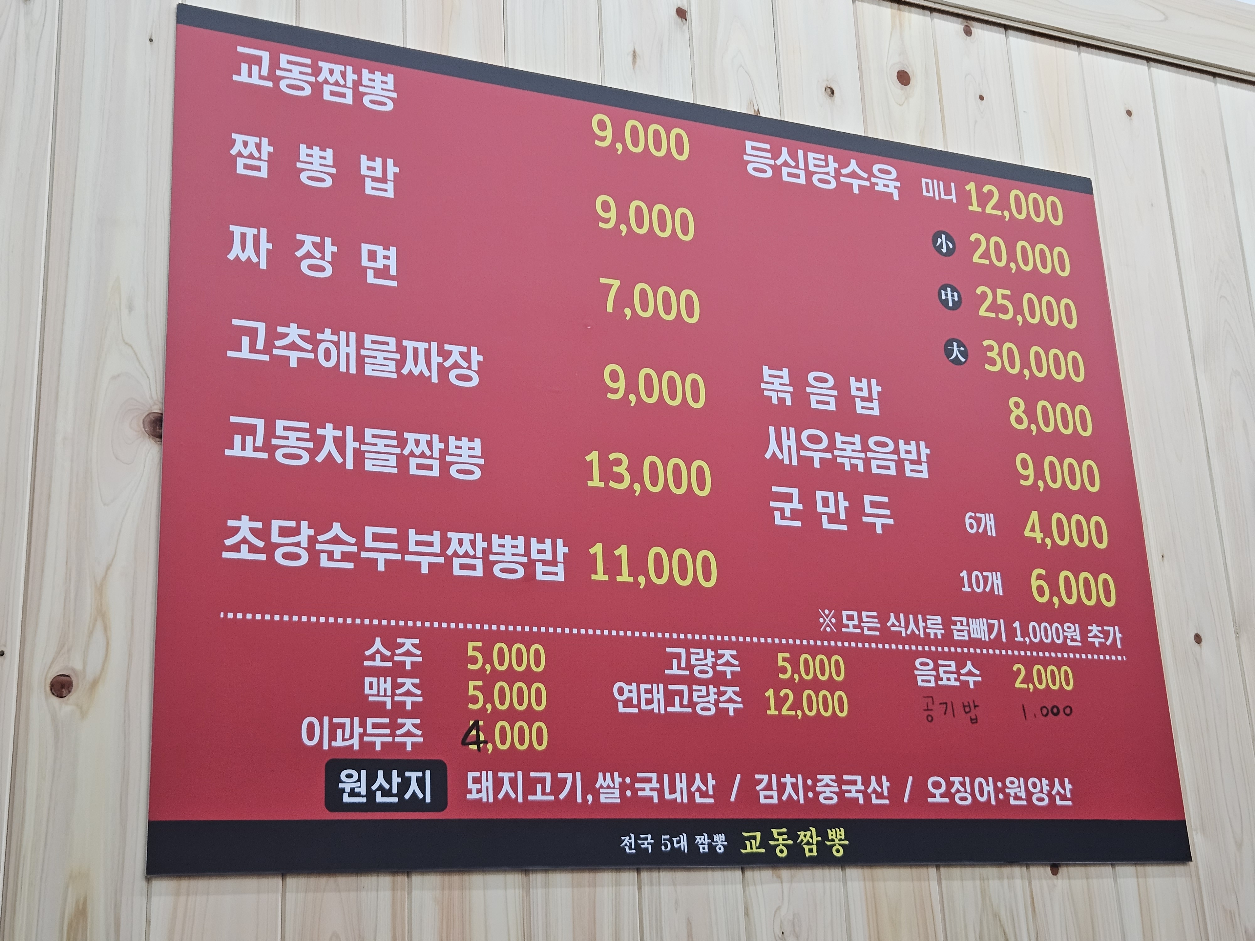 교동짬뽕 세마점 메뉴판 가격 사진을