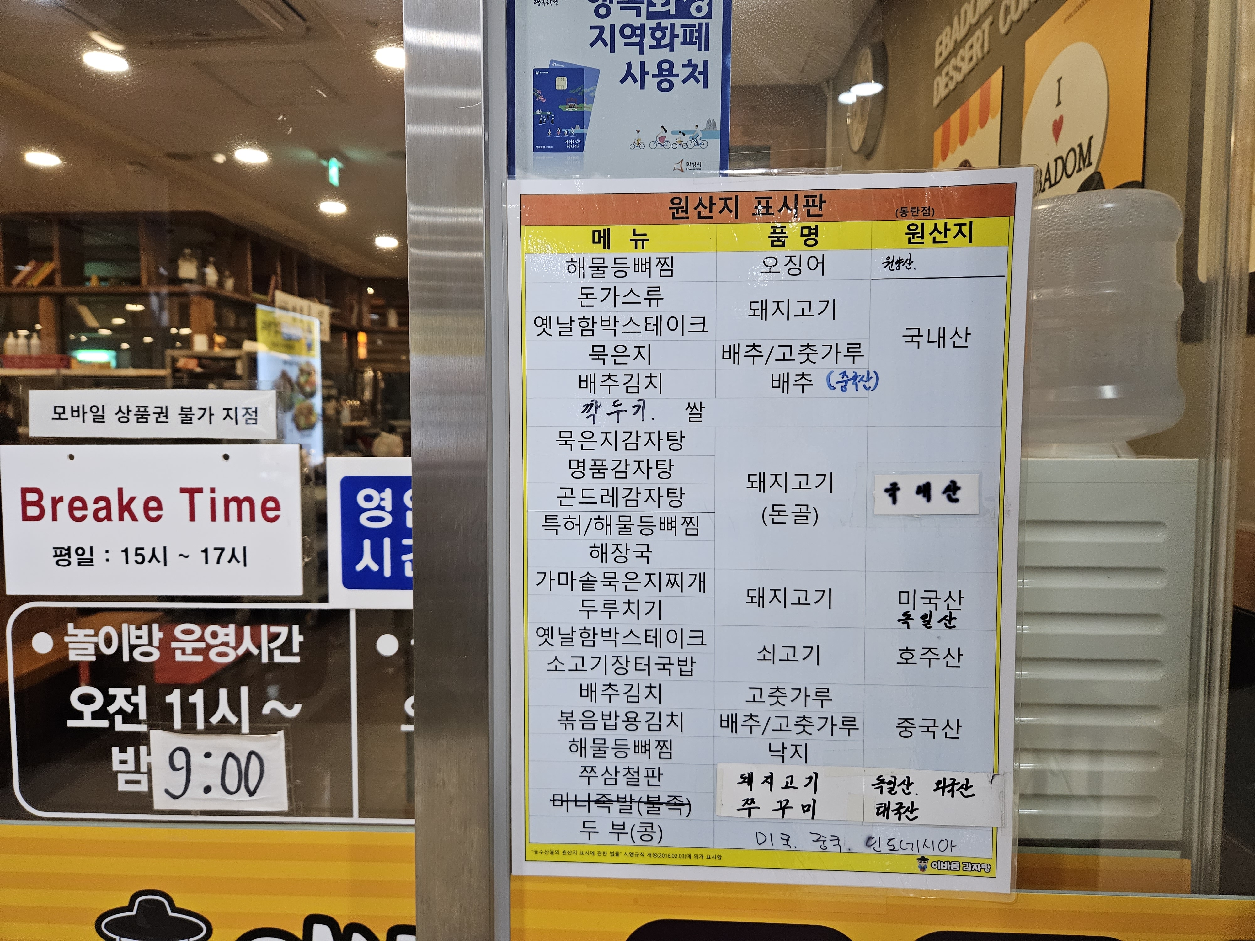 밑반찬도 너무 맛있었고 , 아래는 원산지 표인데요 . 보통은 돼지고기를 국내산 쓰는 너무 좋은 ^^ 감자탕집이었어요. 그래서 군내도 별로 없게 음식도 깔끔하고 참 맛있었어요. 또 지역화폐까지 되니 너무 착한 식당이었죠 ㅎㅎ 동탄 어린이 놀이방 있는 감자탕 맛집으로 추천해보고 싶습니다 ㅎㅎ
