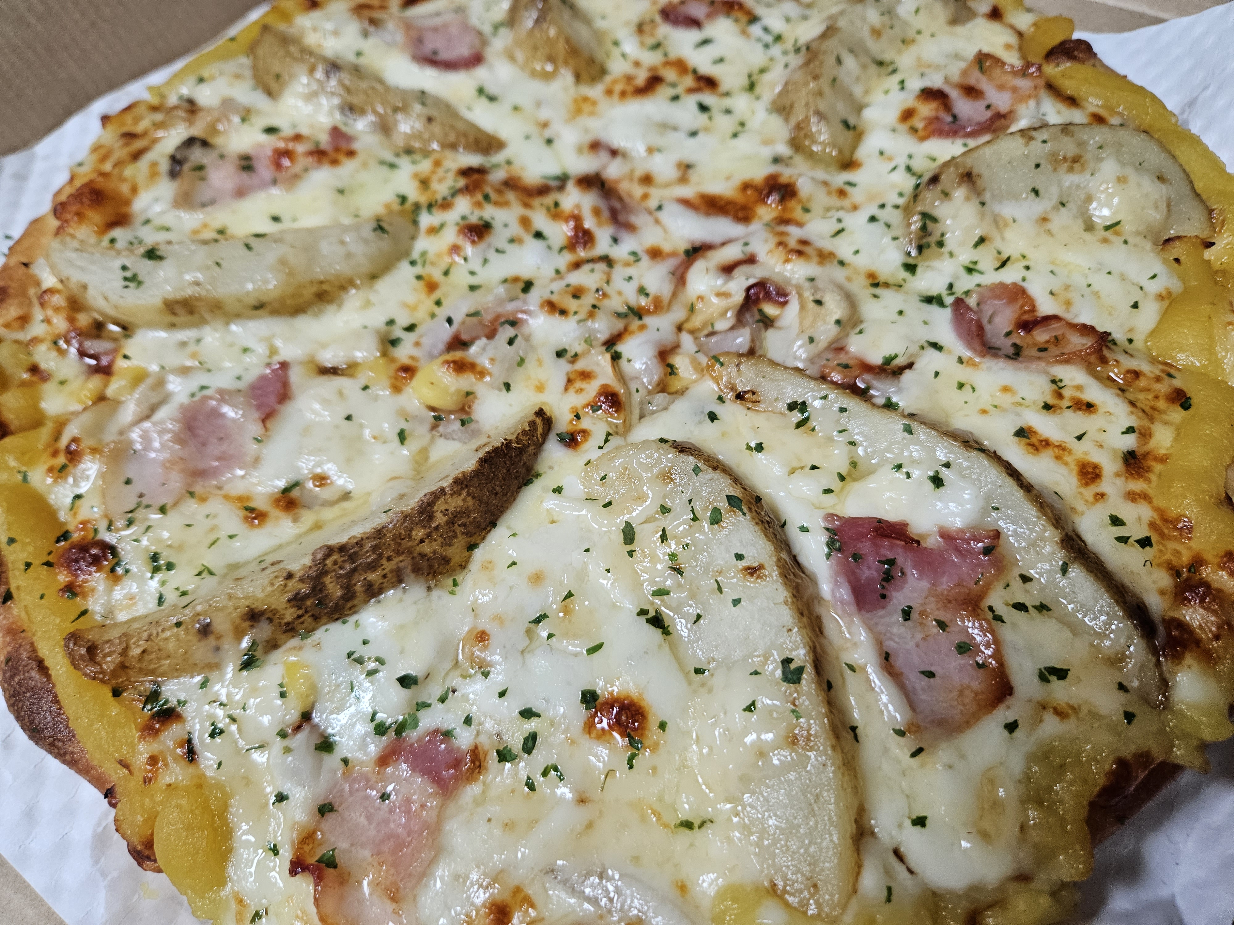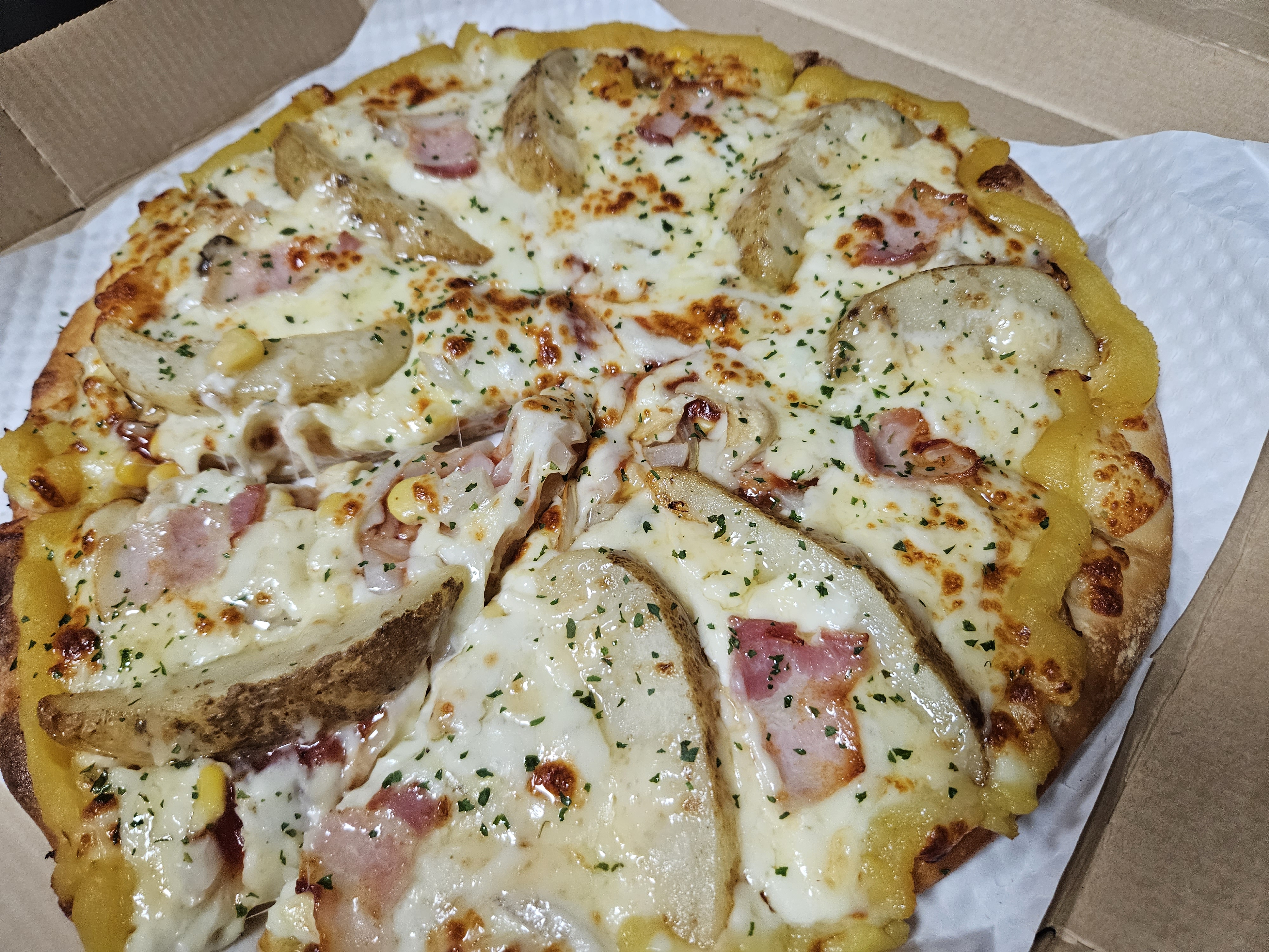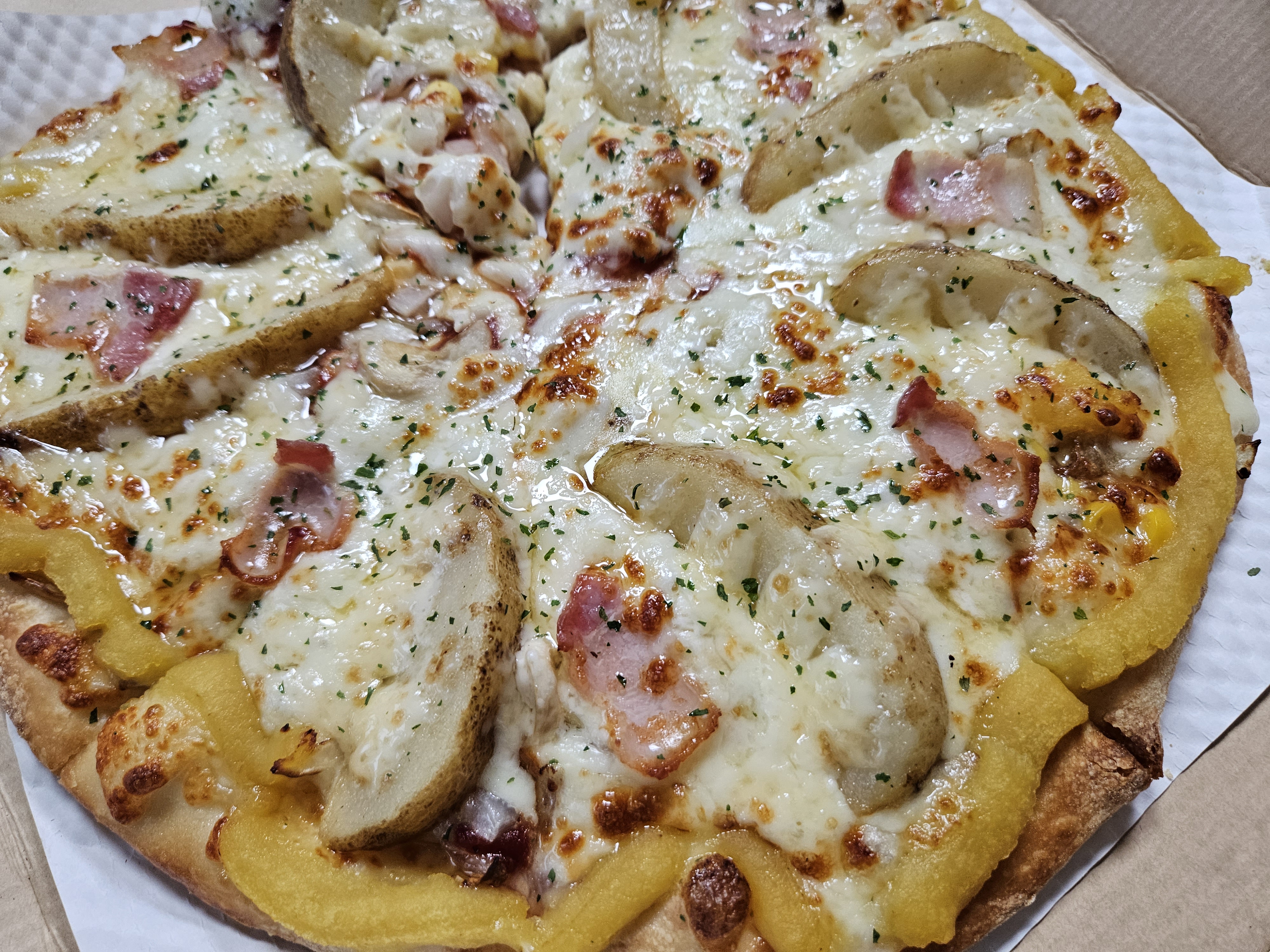 우리는 포테이토 피자에 고구마 무스를 추가해서
